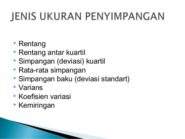rata-rata, simpangan baku, varians, koefisien varians, dan angka baku, namun yang umum digunakan adalah standar deviasi.